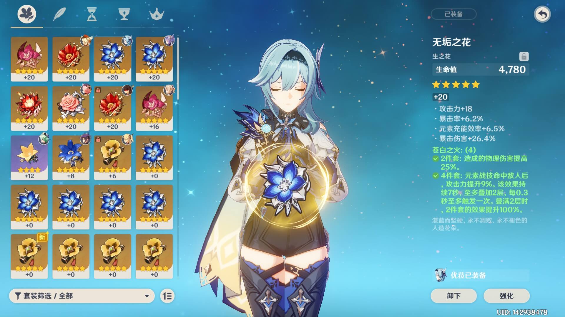 出了个阳寿苍白花,好起来了,终于能勉强给优菈凑个四苍白了。